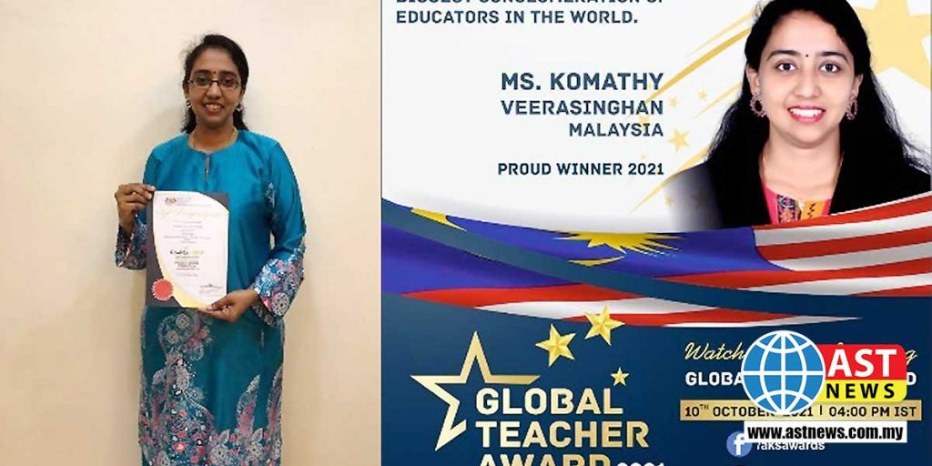 AKS கல்வி அமைப்பின் ஏற்பாட்டிலான 2021 ஆம் ஆண்டுக்கான உலகளாவிய கல்வி விருதை ஈப்போ AVE MARIA CONVENT தேசிய இடைநிலைப் பள்ளியின் ரசாயன ஆசிரியை V. Komathy வென்று சாதனை படைத்திருக்கிறார். 14 ஆண்டு காலமாக ஆசிரியையாக இருந்துவரும் 38 வயதுடைய கோமதிக்கு அனைத்துலக அங்கீகாரத்திற்கான அந்த விருது நேற்று வழங்கப்பட்டது. AKS கல்வி விருதின் YOUTUBE சேனல் இணையம் வாயிலாக நடத்தப்பட்ட சடங்கின் மூலம் கோமதி அந்த விருதை பெற்றுக்கொண்டார். இந்த விருது தமக்கு கிடைத்திருப்பதாக அதன் ஏற்பாட்டாளர்கள் செப்டம்பர் 29ஆம் தேதி தமக்கு தெரிவித்தபோது இன்ப அதிர்ச்சி அடைந்ததாக மூன்று பிள்ளைகளுக்கு தாயான கோமதி தெரிவித்தார்.