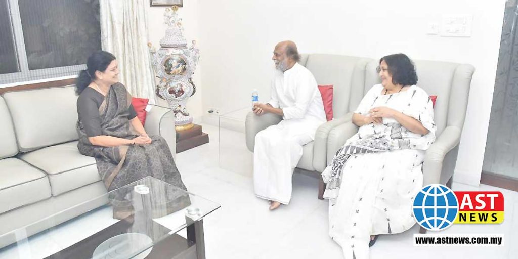 சென்னை போயஸ் கார்டனில் உள்ள ரஜினிகாந்த் வீட்டிற்கு சென்ற சசிசலா, அவரை சந்தித்து பேசினார். அப்போது ரஜினியின் மனைவி லதா ரஜினிகாந்த் உடன் இருந்தார். மரியாதை நிமித்தமாக இந்த சந்திப்பு நடைபெற்றதாக கூறப்படுகிறது. சமீபத்தில் திரைப்படத்துறையின் உயரிய விருதாக கருதப்படும் தாதா சகேப் பால்கே விருதை ரஜினிகாந்த் பெற்றிருந்தார். அதற்கு வாழ்த்து தெரிவிப்பதற்காக சசிகலா சென்றதாக செய்திகள் வெளியானது. என்றாலும், அரசியலை விட்டு ஒதுங்கி திரைப்படங்களில் மட்டும் நடிப்பதில் கவனம் செலுத்தி வரும் ரஜினிகாந்தை சசிகலா சந்தித்துள்ளது பரபரப்பை ஏற்படுத்தியுள்ளது