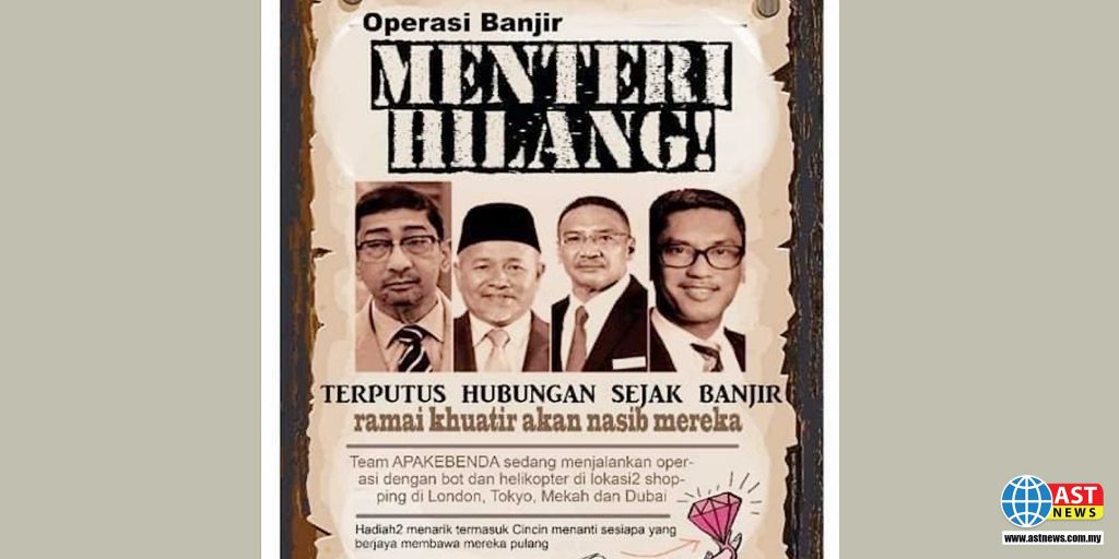 நாட்டில் ஏற்பட்ட மிக மோசமான வெள்ளத்தினால் மக்கள் பாதிக்கப்பட்டுள்ளனர். கஷ்டப்படும் மக்களுக்கு உதவ வேண்டிய 3 அமைச்சர்கள் மற்றும் 1 துணை அமைச்சர் களத்தில் இறங்கவில்லை. தற்காப்பு அமைச்சர் டத்தோஸ்ரீ இஷாமுடின், இளைஞர் விளையாட்டுத் துறை அமைச்சர் டத்தோஸ்ரீ அமாட் பைசால் அசுமு, நீர் வளம் சுற்றுசூழல் அமைச்சர் துவான் இப்ராஹிம் மற்றும் தகவல் தொழில்நுட்ப துணை அமைச்சர் சாஹாடி ஜைனுல் ஆகியோரே காணாமல் போன நான்கு அமைச்சர்கள் என்று பேரா உலு கிந்தா சட்டமன்ற உறுப்பினர் அராபாட் தெரிவித்தார். மக்கள் வெள்ளத்தில் தத்தளித்தார்கள். இவர்களுக்கு உதவ வேண்டிய இந்த நான்கு அமைச்சர்களும் காணவில்லை. ஆகவே இவர்களை கண்டு எடுத்துக் கொடுத்தால் ஆயிரம் வெள்ளி வெகுமதி வழங்கப்படும் என்று அவர் சொன்னார்.