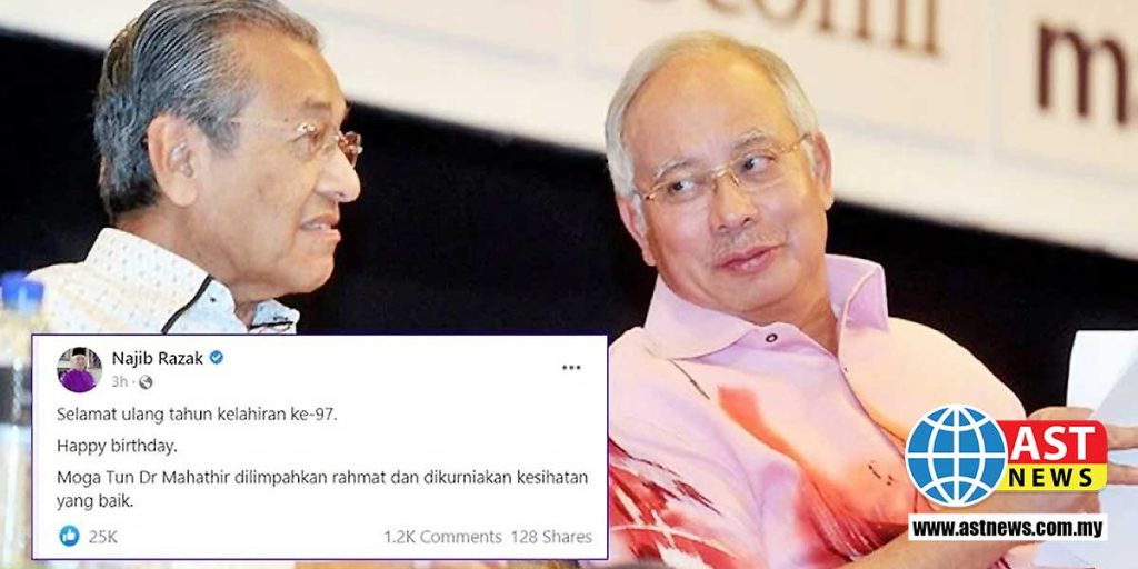 தமது 97-ஆவது பிறந்த தினத்தை நேற்று கொண்டாடிய துன் டாக்டர் மகாதீர் முகமட்டிற்கு முன்னாள் பிரதமர் டத்தோஸ்ரீ நஜீப் ரசாக் பிறந்த நாள் வாழ்த்து தெரிவித்திருந்தது குறித்து வலைத்தளவாசிகள் ஆச்சரியம் அடைந்தனர். ” பிறந்த நாள் வாழ்த்துக்கள். வளமும் நல்ல உடல் நலத்தையும் துன் மகாதீர் பெறவேண்டும்” என தாம் நம்புவதாக முகநூல் மூலமாக அவருக்கு அனுப்பிய வாழ்த்துச் செய்தியில் நஜீப் குறிப்பிட்டிருந்தார். அவர் பகிர்வு செய்திருந்த அந்த வாழ்த்து செய்திக்கு ஒரு மணி நேரத்திற்குள் 21,000 பேர் ” லைக்” தெரிவித்திருந்தனர். சுமார் 1,000 பேர் தங்களது கருத்துக்களையும் தெரிவித்திருந்தனர். தம்மைப் பற்றி மிகவும் மோசமாக குறைகூறிவந்தாலும் டாக்டர் மகாதீருக்கு வாழ்த்து தெரிவித்த நஜீப்பின் பெருமையை வலைத்தளவாசிகள் பாராட்டினர்.