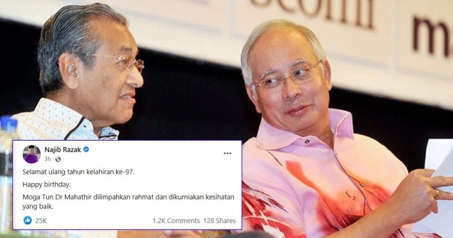 துன் மகாதீர் 97ஆவது பிறந்தநாளை எய்தியதை அடுத்து அவருக்கு வாழ்த்துக்களை முகநூலில் பதிவு செய்து அதிர்ச்சியை ஏற்படுத்தியுள்ளார் முன்னாள் பிரதமர் நஜிப் ரசாக்.