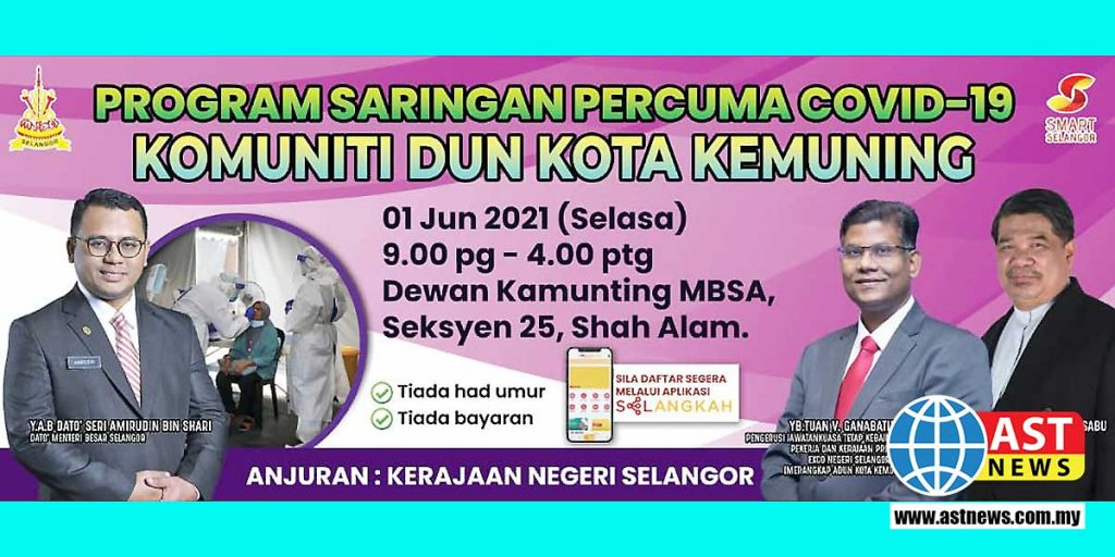 சிலாங்கூர் மாநில அரசாங்கத்தின் ஏற்பாட்டில் ஜூன் ஒன்றாம் தேதி காலை 9 மணி முதல் மாலை 4 மணி வரை கோத்தா சட்டமன்றத் தொகுதியில் இலவச மருத்துவ பரிசோதனை டேவான் MPSA மண்டபத்தில் நடைபெறுகிறது.