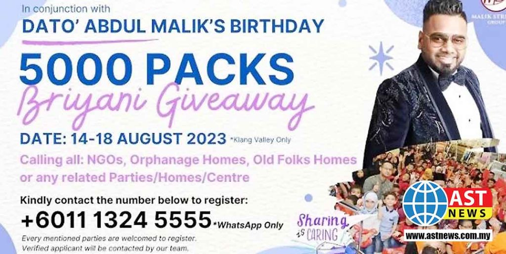 பிரபல தொழிலதிபரும் சினிமா பட விநியோகிஸ்தருமான மாலிக் ஸ்டிரிம் நிறுவனத்தின் உரிமையாளர் டத்தோ அப்துல் மாலிக், தனது பிறந்தநாளை முன்னிட்டு 5000 இலவச பிரியாணி பொட்டலங்களை வழங்குகிறார்.