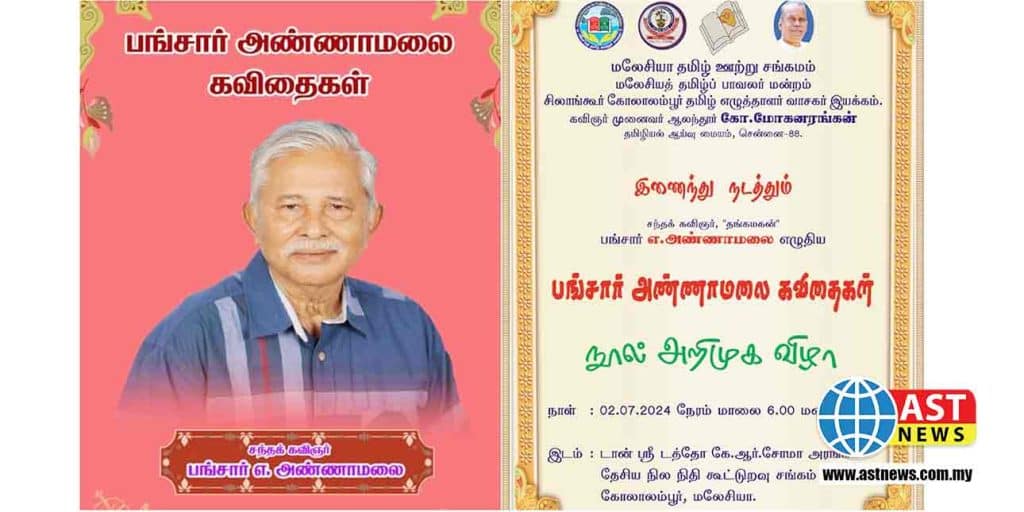 பாபநாசம் சிவன், பட்டுக்கோட்டை கல்யாணசுந்தரம், உடுமலை நாராயண கவி போன்ற தமிழகத்து கவிப்பெருமக்கள் வரிசையில் இந்த மலையகத்திலும் ஊர்ப்பெயரை தன் பெயருடன் இணைத்துக் கொண்ட கவிவாணரான பங்சார் எ.அண்ணாமலையின் கவிதை நூல் வெளியீட்டு விழா, இன்று மாலையில் அனைவருக்கும் அறிமுகமான தலைநகரத்து டான்ஸ்ரீ கே.ஆர். சோமா அரங்கில் நடைபெறுகிறது.