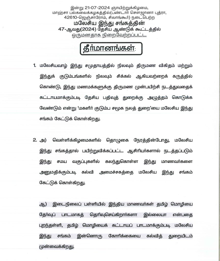 இதன் தொடர்பில், மலேசிய இந்து சங்கம் இவ்வாரத் தொடக்கத்தில் நடத்திய 47-ஆவது தேசிய ஆண்டுக் கூட்டத்தில் நிறைவேற்றிய ‘ஏழு’ தீர்மானங்களில் 2-ஆவது தீர்மானமே இடைநிலைப்பள்ளிகளில் தமிழ் பாடத்தைக் கட்டாயம் ஆக்க வேண்டும் என்பதுதான்.