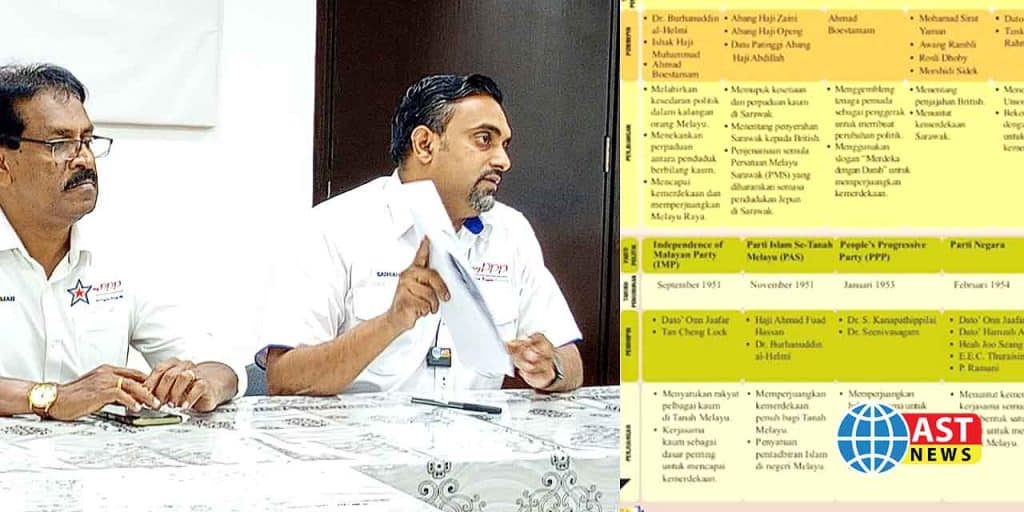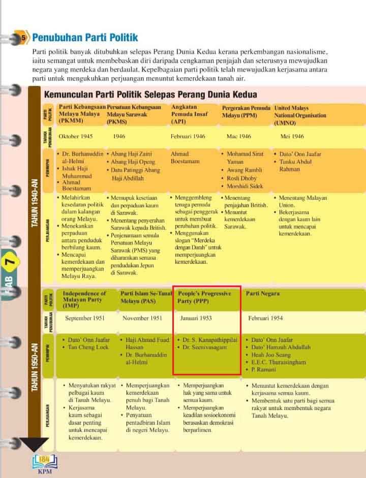 நாட்டில் உள்ள படிவம் 4 வரலாற்று பாடப்புத்தகத்தில் இரண்டாம் உலகப் போருக்கு பின்னர் தோற்றுவிக்கப்பட்ட கட்சிகளின் பெயர்களையும் அதன் தலைவர்களின் பெயர்களும் இடம் பெற்றுள்ளன.