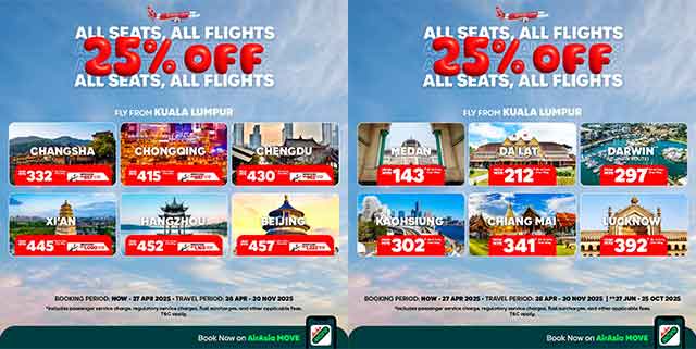 ஏர் ஆசியா (AirAsia) தனது பயணிகளை மகிழ்விப்பதற்காக மலேசியா (AK) மற்றும் ஏர் ஆசியா X (D7) விமானங்களுக்காக 25% தள்ளுபடி சலுகையை அறிவித்துள்ளது.