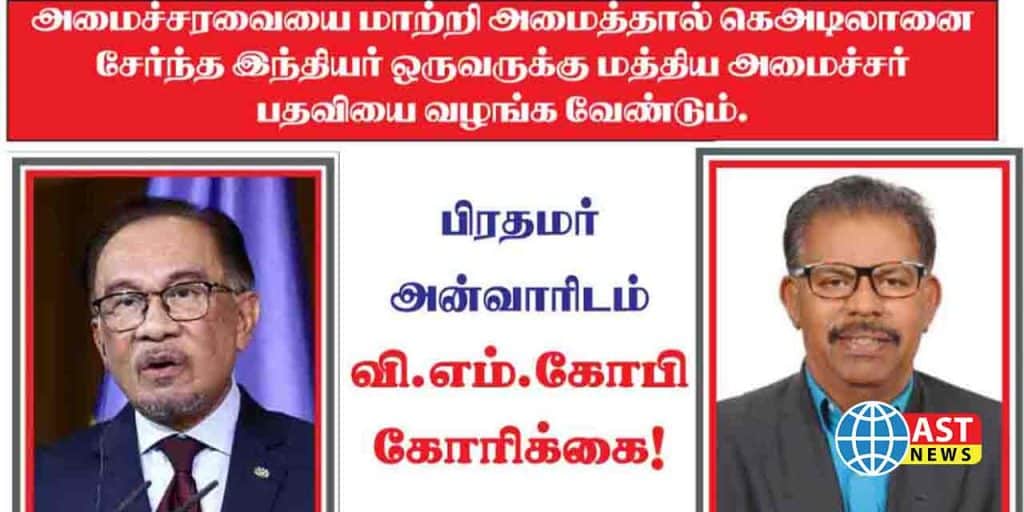 அமைச்சரவை மாற்றத்தின் பொழுது கெஅடிலானை நேர்ந்த இந்தியர் ஒருவருக்கு அமைச்சர் பதவியை பிரதமர் டத்தோ ஸ்ரீ அன்வார் வழங்க வேண்டும் என்று மக்கள் பொது நல செயல்கட்சியின் தேசியத் தலைவர் வி.எம்.கோபி அன்பு வேண்டுகோள் விடுத்தார். இது சம்மந்தமாக பிரதமருக்கு உடனடி அவசர கடிதத்தை அனுப்பவிருப்பதாக தெரிவித்தார். இதன் வழி கெஅடிலான் இந்திய உறுப்பினர்களுக்கு புதிய நம்பிக்கையையும் எழுச்சியையும் ஏற்படுத்தும் என்றும் முன்னாள் விலாய மாநில கெஅடிலான் துணைத்தலைவருமான வி.எம்.கோபி தெரிவித்தார்.