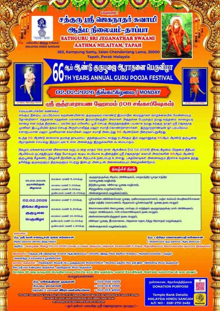 The 66th Annual Guru Pooja of Sathguru Sri Jeganathar Swaami will be held at Sathguru Sri Jeganathar Swaami Aathma Nilayam, Tapah.