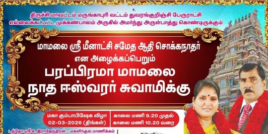 தமிழ்நாட்டில் அமைந்துள்ள நரசிங்கபுரம் பட்ட சுப்பிரமணியசாமி தேவஸ்தானத்தின் கீழ் செயல்படும் மாமலை ஸ்ரீ மண்டாடி தேவர் ஆதீ சொக்கநாதர் திருக்கோவிலில், பரம்பரை மாமலை நாத ஈஸ்வரர் சுவாமிக்கு நடைபெற்ற கும்பாபிஷேக நிகழ்வு பக்தி பரவசத்துடன் மிகச் சிறப்பாக நடைபெற்றது.