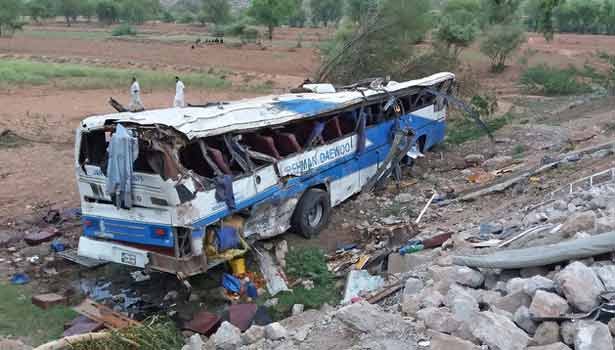பாகிஸ்தான் நாட்டின் பஞ்சாப் மாகாணம் லாகூரில் இருந்து கைபர் பகதுன்வா மாகாணத்தில் உள்ள மர்தான் என்ற இடத்திற்கு பஸ் ஒன்று சென்று கொண்டிருந்தது. வேகமான சென்ற பேருந்து திடீரென விபத்திற்குள்ளாகி பள்ளத்தாக்கில் கவிழ்ந்தது.