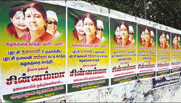 அதில் ஜெயலலிதா, சசிகலா, எம்.ஜி.ஆர். புகைப்படங்களுடன் இடம்பெற்றுள்ள வாசகங்கள் வருமாறு:- கழகத்தை காத்திட வாரீர்! வாரீர்!! புரட்சி தலைவர் உருவாக்கிய புரட்சி தலைவி அம்மா கட்டிக்காத்த கழகத்தை காத்திட தியாக தலைவி சின்னம்மா தலைமையில் ஒன்றிணைவோம்… அ.தி.மு.க. தொண்டர்கள் புதுக்கோட்டை மாவட்டம் என்ற வாசகம் இடம்பெற்றுள்ளது. இந்த சுவரொட்டிகள் புதுக்கோட்டை நகரப்பகுதியில் ஆங்காங்கே பல இடங்களில் ஒட்டப்பட்டுள்ளன.